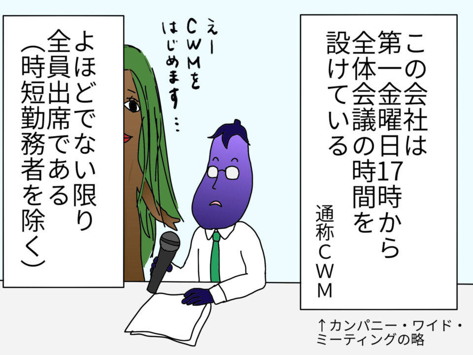 漫画の中にも書いたが、時短勤務者はこの全体会議も免除なのだw