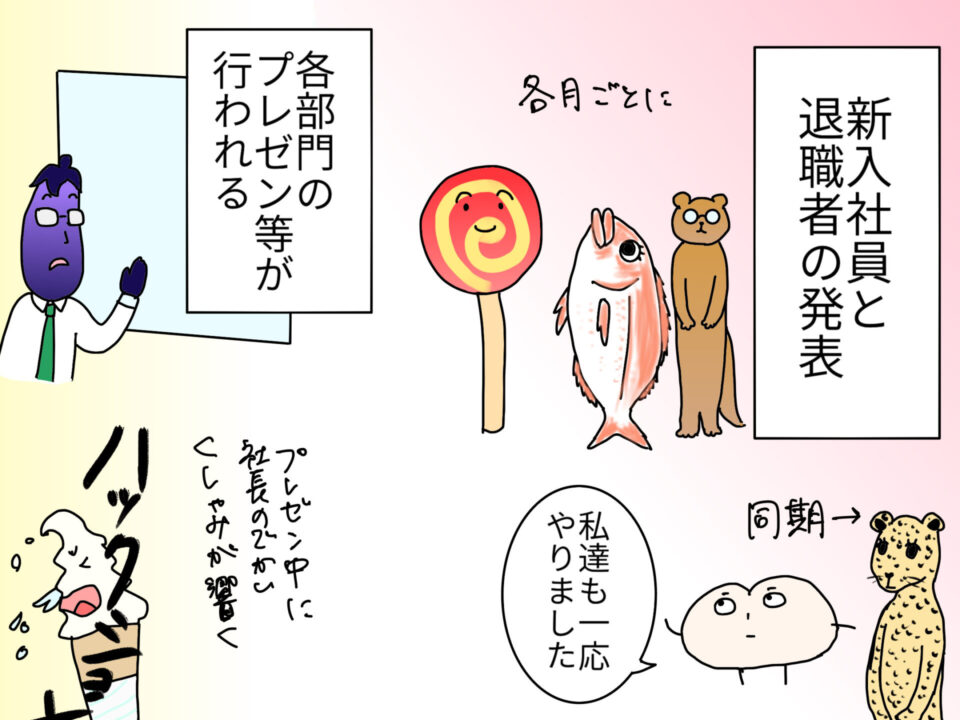 (2コマ目の新人イタチさん→第24話登場 は入社時から時短勤務者だが、紹介時だけ出席しすぐに退勤していた。)